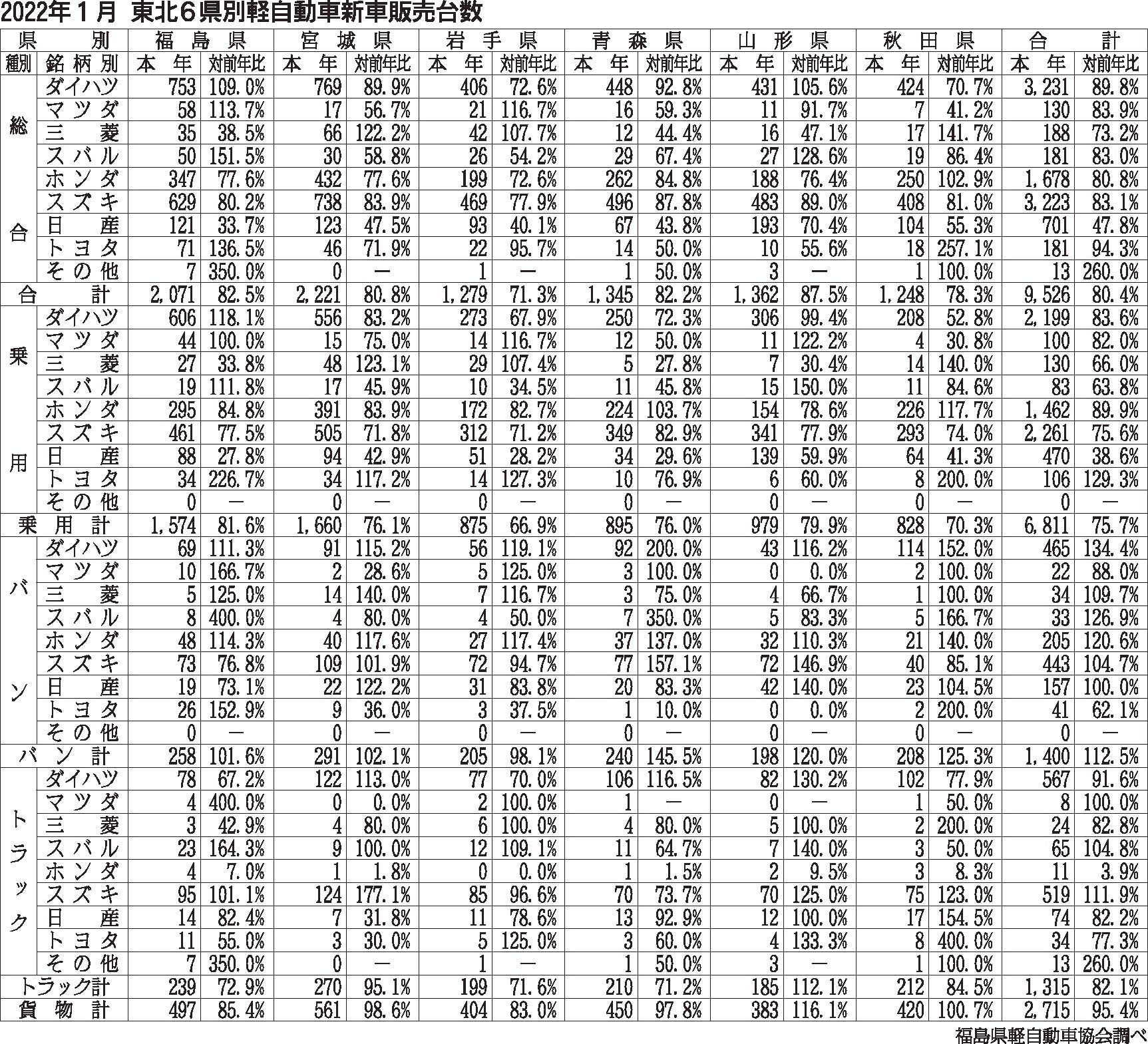 〈2022年1月 東北6県別軽自動車新車販売台数〉