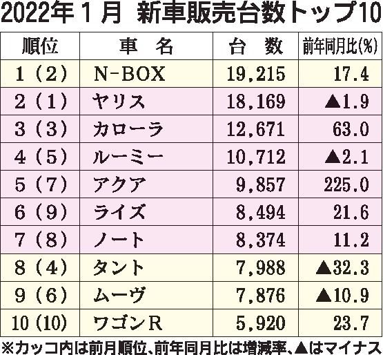 2022年1月の新車販売ランキング、「N-BOX」首位奪還 軽の回復出遅れでトップ10は大幅変動