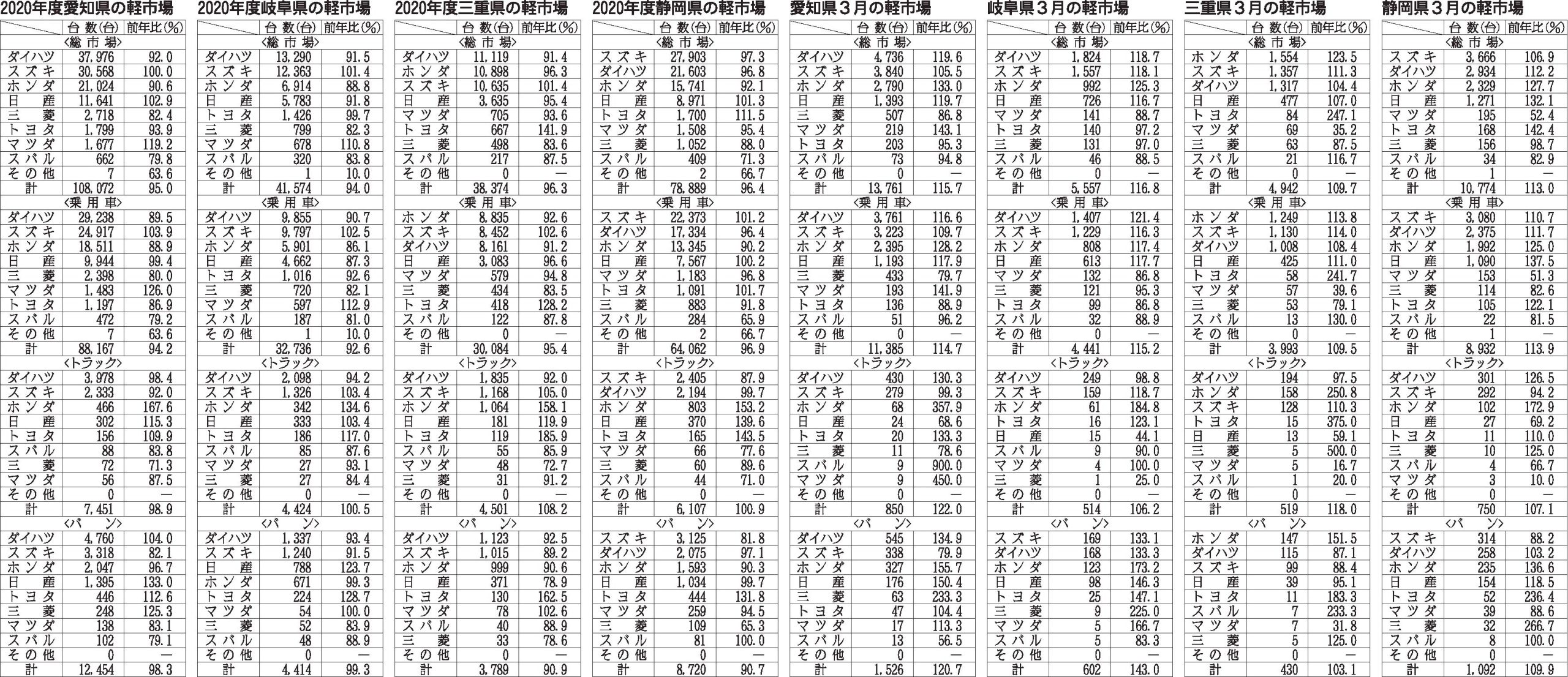 〈中部4県 20年度と3月単月の軽市場〉愛知県/岐阜県/三重県/静岡県