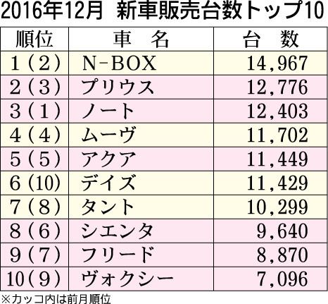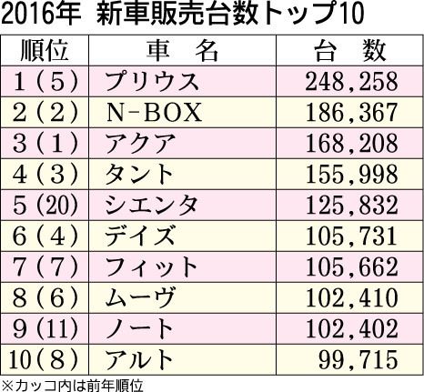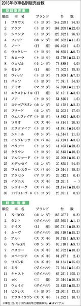 2016年の新車販売の車名別順位(軽自動車含む)は、トヨタ「プリウス」が4年ぶりに首位を獲得した。15年末の全面改良以降、1月から8月までトップを独走し、年間首位に立った。2位には昨年に続き、ホンダ「N―BOX」がつけた。3位には前年1位...