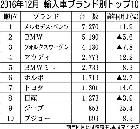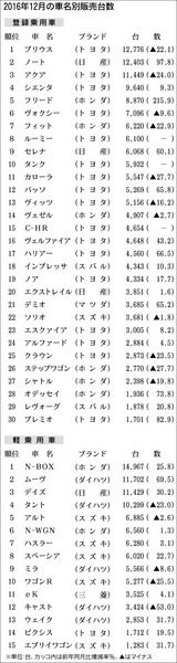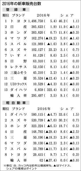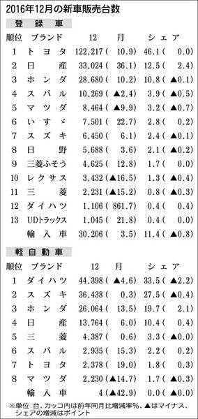 【2016年通年および12月の新車販売台数】