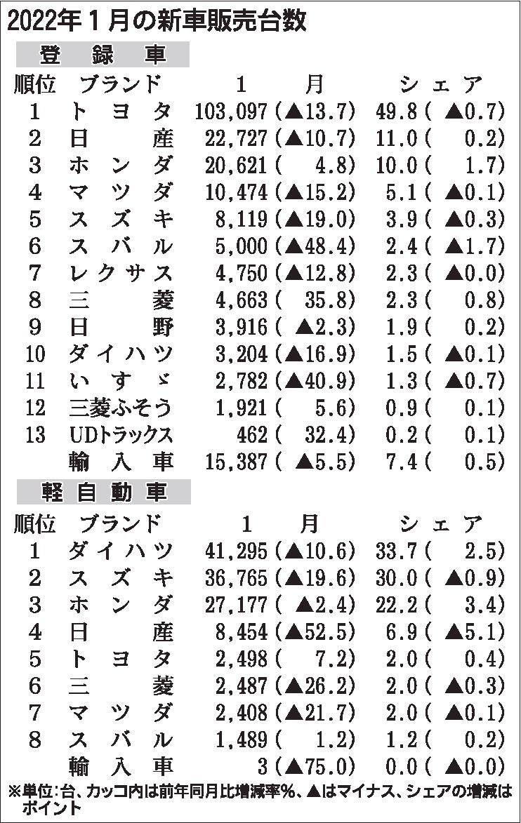 〈2022年1月の新車販売台数〉