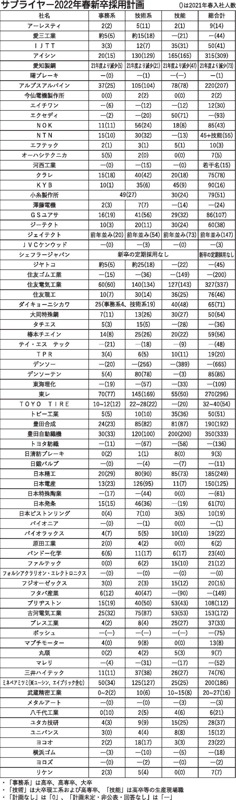 サプライヤー各社の2022年春入社の新卒採用計画は、増やす企業と減らす企業がほぼ半分で、まだら模様となっている。日刊自動車新聞社が実施したサプライヤーに対する新卒採用計画の調査で回答した76社のうち、23社が21年春入社と比べて増やすと回...