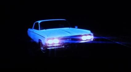 新婚旅行中の夫婦が乗る空色のフルサイズ2ドアクーペ「オールズモビル 98ホリディ・スポーツクーペ」が闇に包まれた深夜の田舎町の山道を走る。夫婦は曲がり角を間違えた上に、車がぬかるみから出られなくなった。ホラー映画「戦慄!呪われた夜」のワン...