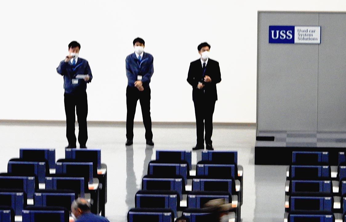 【横浜】ユー・エス・エス(USS)横浜会場(堂薗雅隆会場長)は4月に新会場長を迎えた。年度初めのオークション(AA)では、新会場長の堂薗氏と前会場長で4月より大阪会場長に就任した方山直義氏がそろって挨拶に立った=写真。 堂園新会場長は「横...
