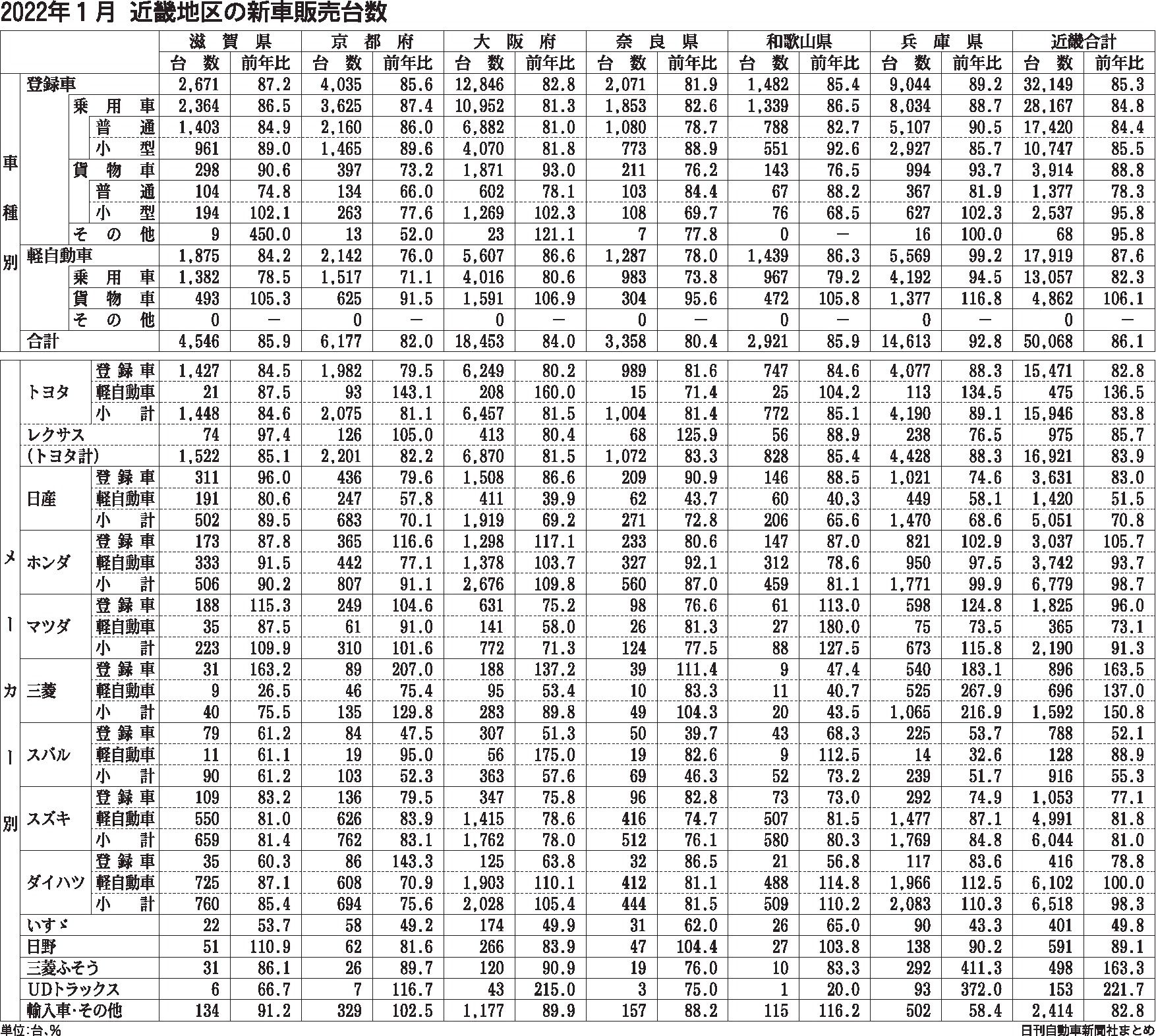 近畿2府4県の1月の新車販売台数(登録車+軽自動車)は前年同月比13・9%減の5万68台だった。前年割れは7カ月連続。12月比で落ち込み幅が0・9㌽拡大した。昨年10、11月の3割減からは脱したものの、直近3カ月は15%減前後の低水準が続...