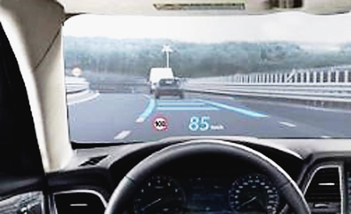 従来のHUDは、ダッシュボードから画像を投射し、フロントガラスの反射を用いることで画像を映し出していた。前方の視界を確保するために、ガラス自身の表面反射を利用しており、二重像が発生しやすかった。