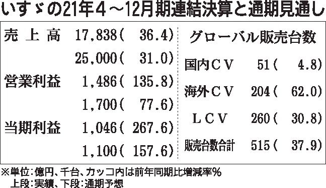 21年4~12月期のグローバル販売台数はトラックが同46%増の25万5千台、ピックアップトラックなどのLCVが同31%増の26万台だった。半導体不足の影響で国内のトラックとタイのピックアップトラックは前年を下回ったものの、海外向けのトラックが好調だった。このほか、為替変動で198億円、原価低減で136億円の増益効果があった。
