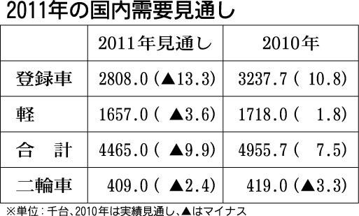 日本自動車工業会は17日、2011年暦年の国内四輪車需要が、登録車と軽自動車の合計で前年比9・9%減の446万5千台になるとの見通しを発表した。10年の新車販売は6年ぶりに前年を上回る見込みで、エコカー補助金終了による反動減と景気の不透明...