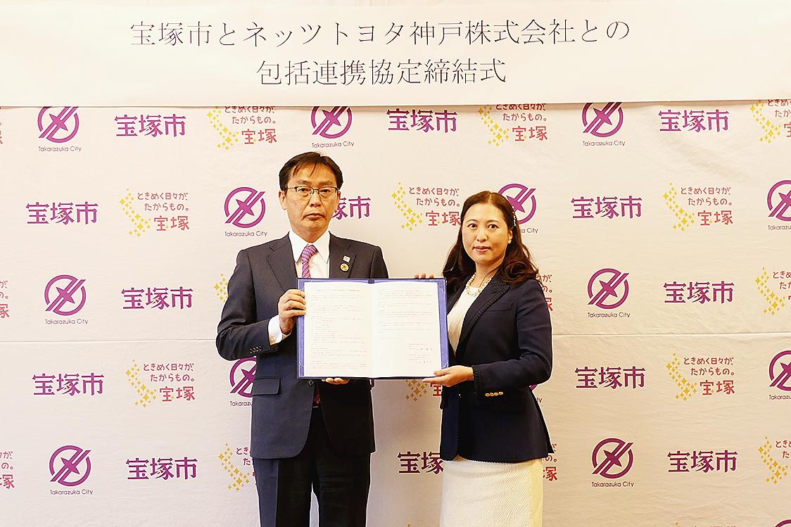 【神戸】ネッツトヨタ神戸(四宮康次郎社長)は、宝塚市と包括連携協定を締結した=写真。主な連携内容は、子どもたちの職場体験の場づくりのほか、給電や物資の輸送などの災害時における支援、ハーフマラソンへの支援などのスポーツ振興、次世代小型モビリ...