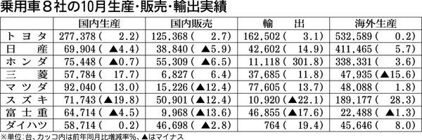 乗用車メーカー8社は27日、2015年10月の生産・輸出実績を発表した。8社合計の国内生産は14年6月以来、16カ月ぶりに増加に転じた。軽自動車税増税の影響は依然として残るが、輸出の増加などが台数を引き上げた。海外生産はトヨタ自動車、日産...