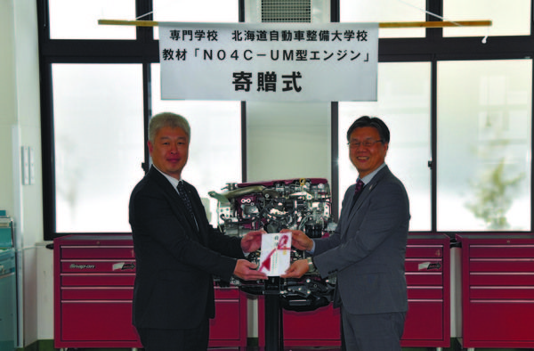 日野自動車と北海道日野自動車(飯島秀也社長)はこのほど、教育支援の一環として北日本自動車大学校、北海道自動車整備大学校、旭川高等技術専門学院に実習教材用エンジンを寄贈した。 長嶋勝日野自動車国内営業部長、飯島北海道日野自動車社長らが訪問し...
