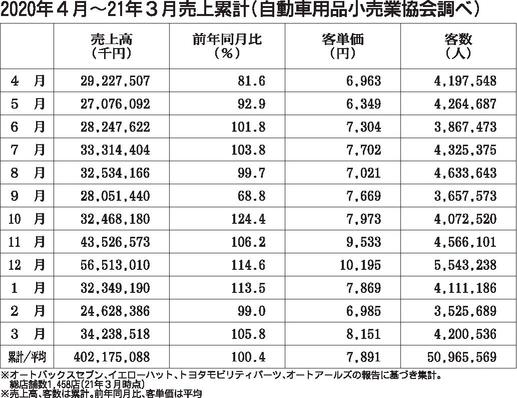 自動車用品小売業協会(APARA、小林喜夫巳会長)は19日、2020年度の用品売上高統計を発表した。売上高は前年度比0・4%増の4021億7508万8千円(新店含む)で2年ぶりのプラスに転じ、既存店ベースでも3年ぶりのプラスとなった。バッ...