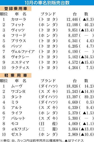 日本自動車販売協会連合会(自販連、天野洋一会長)が7日に発表した10月の登録乗用車車名別販売ランキングによると、トヨタ自動車「カローラ」が12カ月ぶりにトップに立った。同車は10月に仕様変更を行い一部モデルで販売価格を引き下げており、こう...