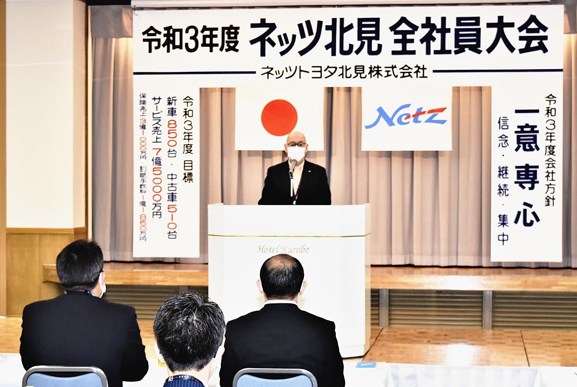 【北見】ネッツトヨタ北見(栗山太郎社長)は、北見市内のホテルで「令和3年度全社員大会」を開催した。新車販売850台をはじめとする年度目標の達成に向け、士気を高めた。また大会後にAED(自動体外式除細動器)講習会も行い、万一の際の対応を再確...
