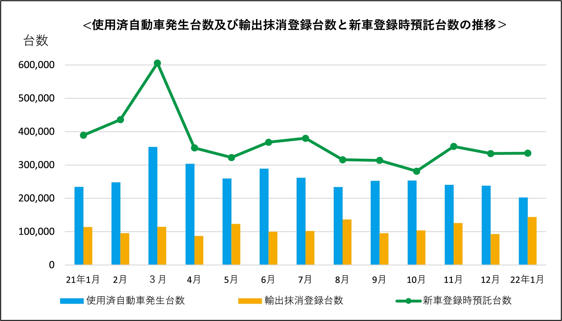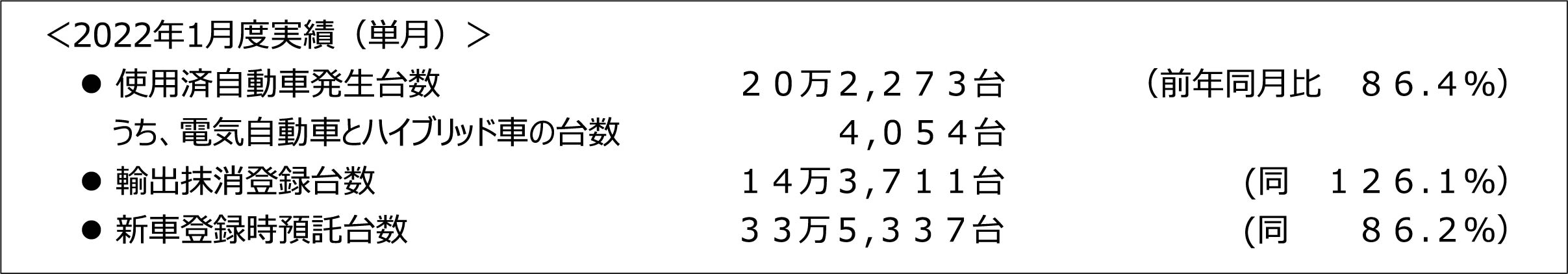 輸出抹消登録台数は14万3711台(同126.1%)。新車登録時預託台数は33万5337台(同86.2%)だった。