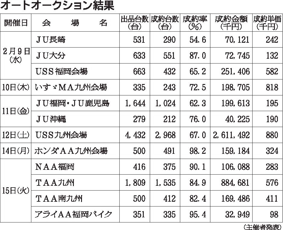 〈オートオークション結果〉九州地区 2022/2/9~15