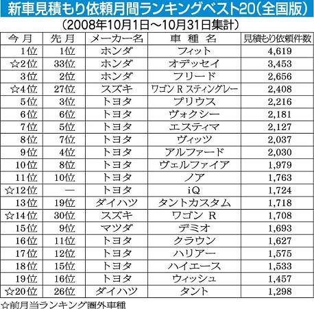 オートックワンが集計した10月の新車見積もり依頼ランキングは同月に発売されたホンダ・オデッセイ、スズキ・ワゴンRスティングレーがそれぞれ2位、4位に入ったもののホンダ・フィットの人気は揺るがず、4カ月連続で首位の座を守った。 3位には前月...