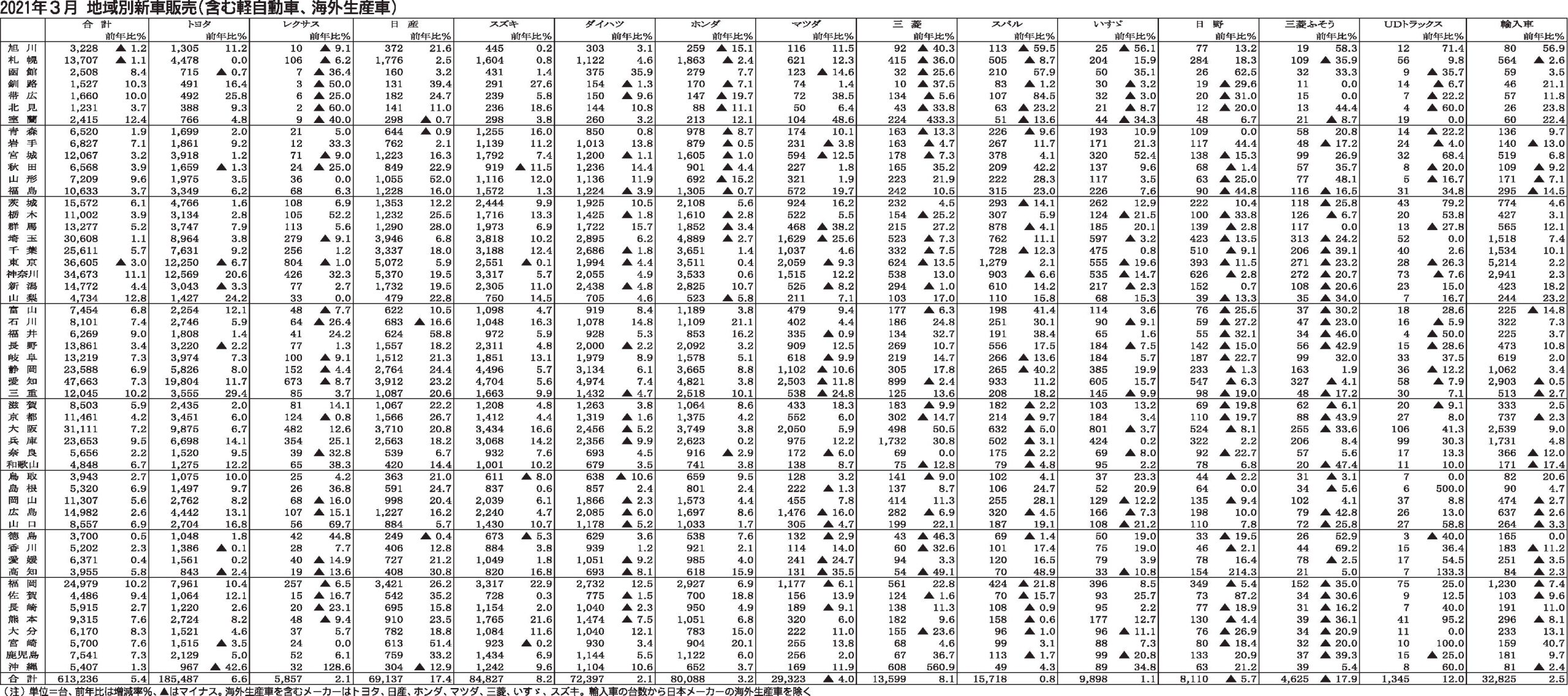 〈2021年3月 地域別新車販売(含む軽自動車、海外生産車)〉