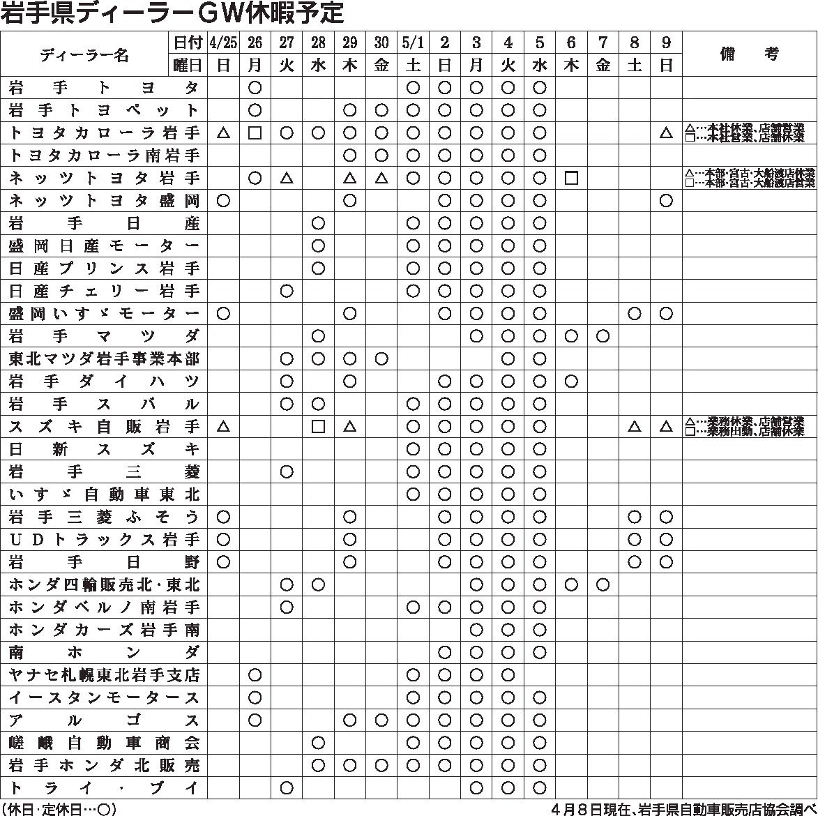 〈岩手県ディーラー 2021年GW休暇予定〉