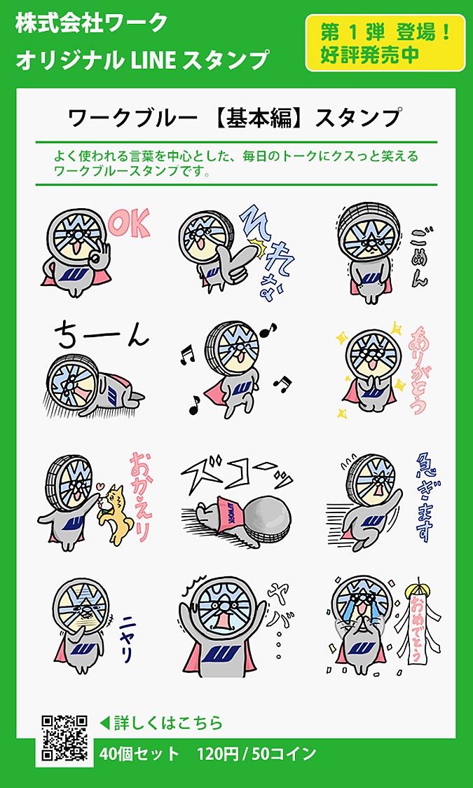 ワーク(田中知加社長、大阪府東大阪市)は、新規事業展開としてオリジナルキャラクターの「ワークブルー」をモチーフにしたLINEスタンプを発売した。第1弾は日常で使用することが多いフレーズを入れた40種の基本編で、価格は消費税込みで120円(50コイン)。同社では第2弾、第3弾の発売を予定しており、より幅広い年齢層や顧客層に利用してもらえるスタンプの制作に取り組む。ワークのファンやクルマ好き、カスタム好きのユーザーへの露出効果を高めるほか、これまで接点がなかった人にも同社を知るきっかけとして役立てていきたい考えだ。