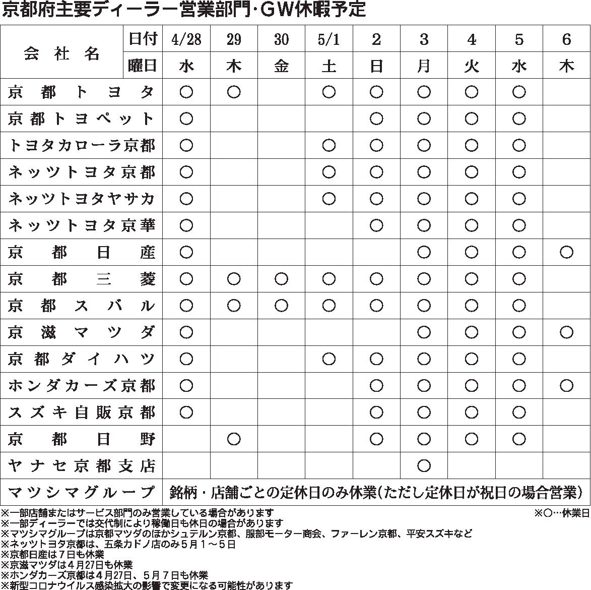 〈京都府主要ディーラー営業部門・GW休暇予定〉