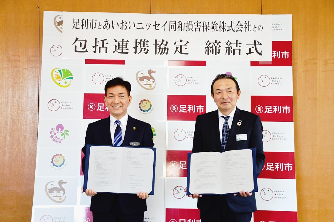 【宇都宮】あいおいニッセイ同和損害保険栃木支店(加川克仁支店長)は、足利市(早川尚秀市長)と生涯学習など5項目の分野で包括連携協定を締結した。同社が県内の自治体と同協定を結ぶのは今回で13カ所目となる。足利市役所で締結式が行われ、加川支店...