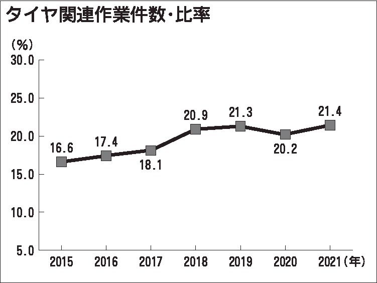 【大阪】日本自動車連盟(JAF)大阪支部(白土貴久支部長)は、2015年以降の支部管内のタイヤ関連による救援依頼の傾向をまとめた。タイヤ関連の救援依頼は増加傾向にあり、21年には15年比で約5㌽上昇した。同支部は運行前の適切な車両点検の実...
