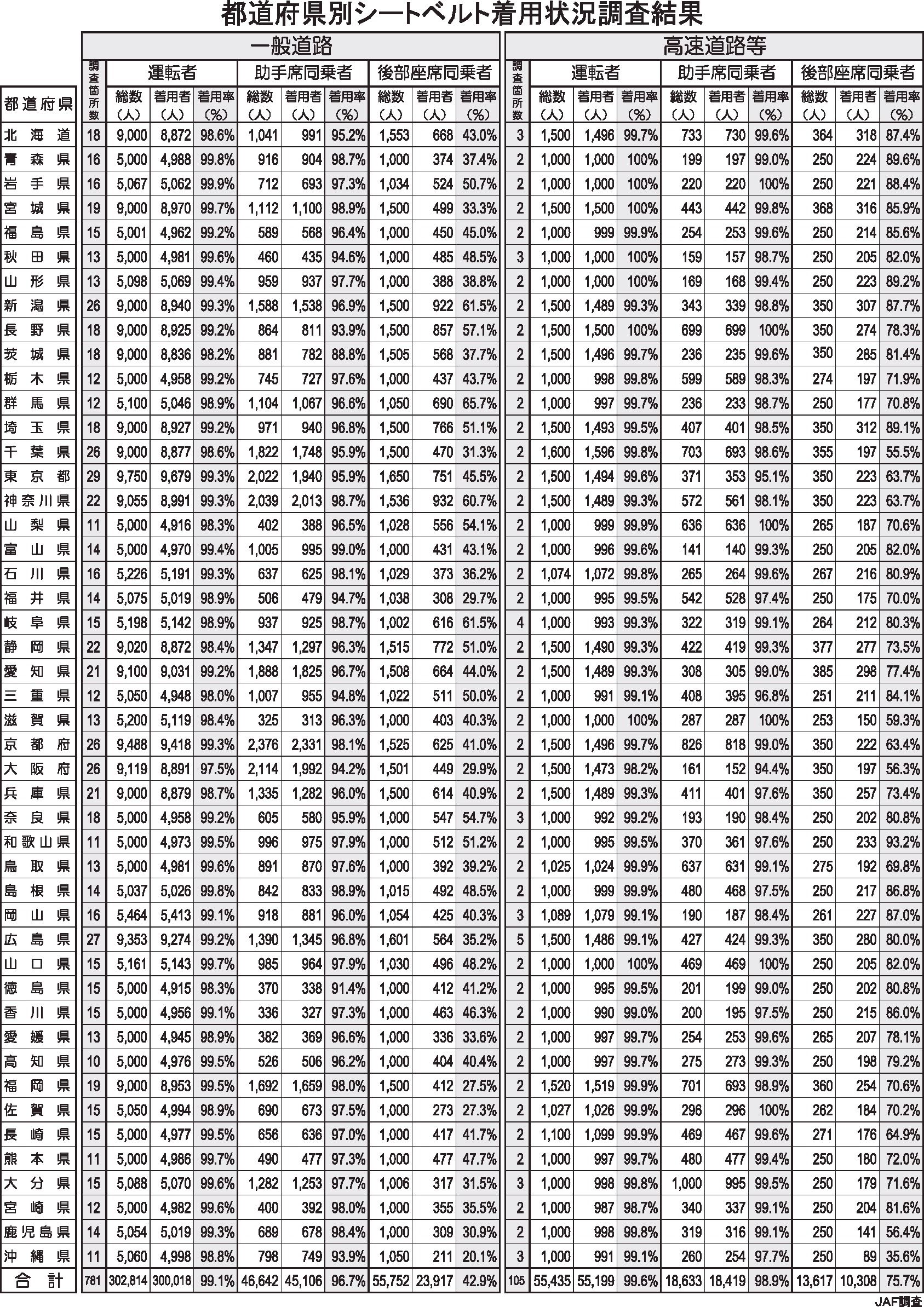 日本自動車連盟(JAF、藤井一裕会長)と警察庁が実施した「シートベルト着用状況全国調査」で、後部座席のシートベルト着用率が一般道路で42.9%(前年比2.6ポイント増)となった。過去最高の実績となったものの、依然として半数を割り込んでおり、ドライバーの意識の低さが明らかになった。高速道路での着用率は75.7%(同0.1ポイント減)だった。