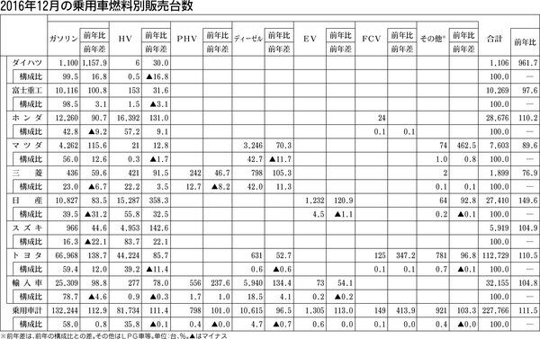 日本自動車販売協会連合会(自販連)がまとめた2016年12月の乗用車燃料別販売台数は、ハイブリッド車(HV)が前年同月比11・4%増の8万1734台で13カ月連続で前年実績を上回った。16年の車名別販売で首位となったトヨタ「プリウス」、コ...