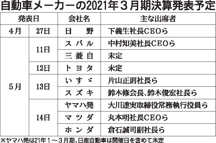 自動車メーカーの2021年3月期通期決算の発表が27日から始まる。新型コロナウイルス感染拡大による需要減の影響が色濃く表れ、先行きが見通せない状況下でスタートを切ったが、20年第1四半期(4~6月期)を底に、世界経済の回復に合わせて各社の...
