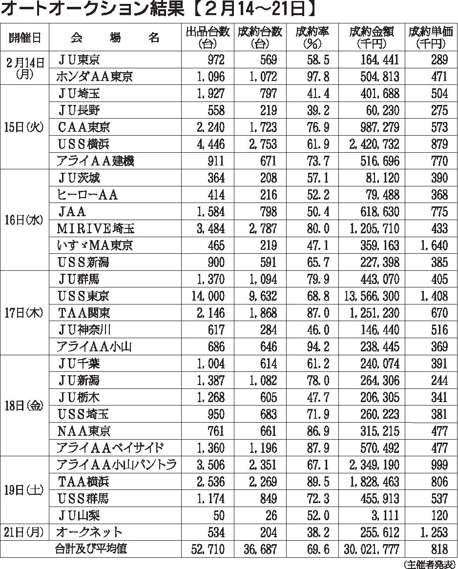 〈オートオークション結果〉首都圏 2022/2/14~21