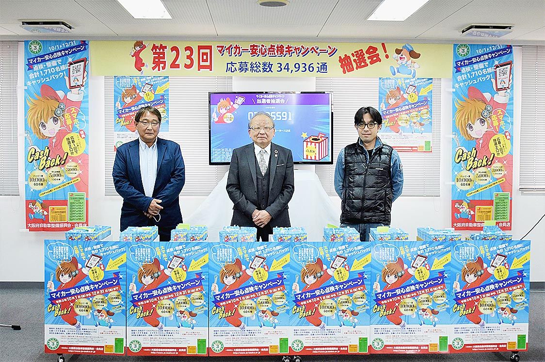 大阪府自動車整備振興会(大整振、山本昇会長)は21日、大阪府自動車整備会館(大阪市住之江区)で「第23回マイカー安心点検キャンペーン抽選会」を開いた=写真。応募はがき3万4936通の中からハッピー賞(1万円引換券)の当選者60人分を選んだ...