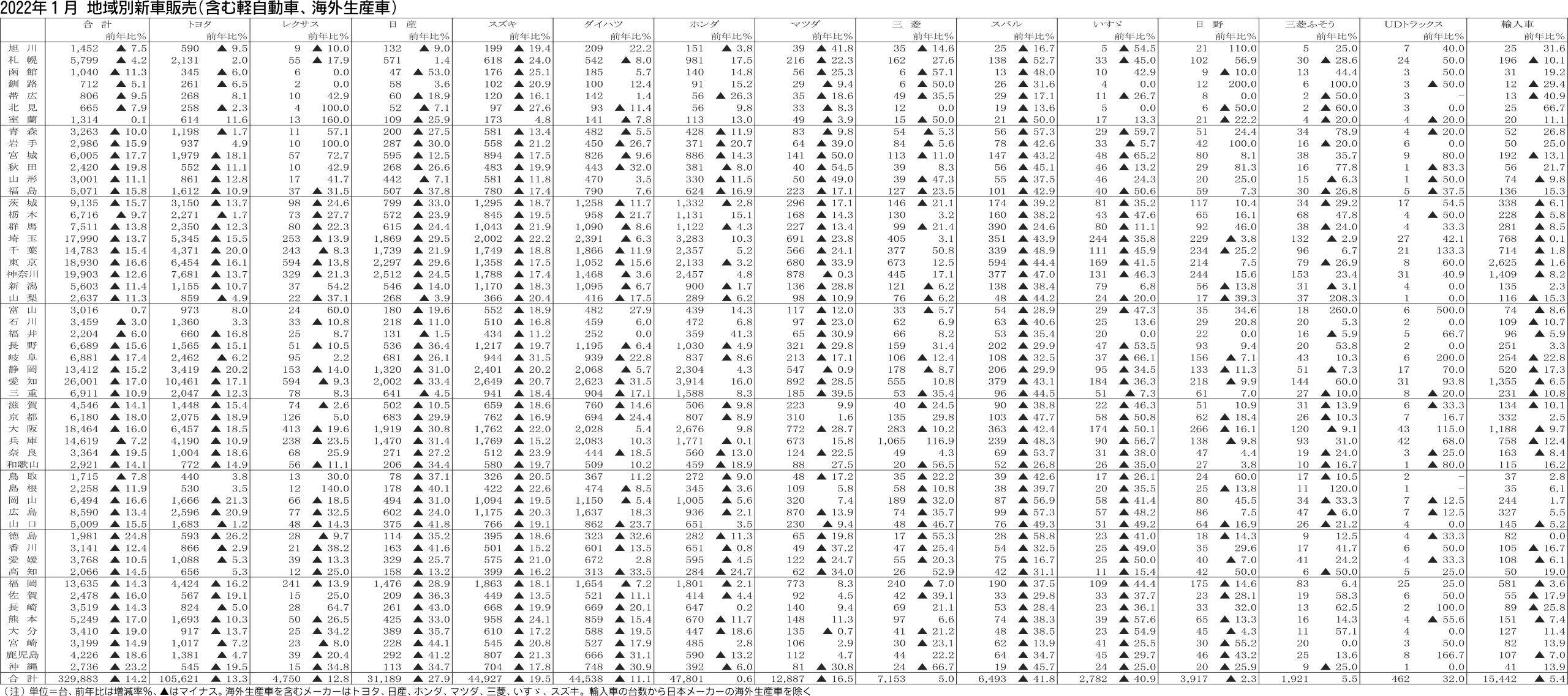 〈2022年1月 地域別新車販売(含む軽自動車、海外生産車)〉