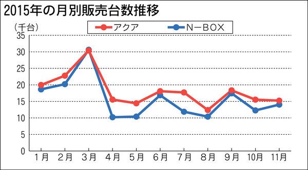 新車販売の車名別ランキングで、登録車ではトヨタ自動車の「アクア」が、軽自動車ではホンダの「N―BOX(エヌボックス)」がそれぞれ年初から強さをみせ、2015年の年間ナンバーワンの座を確実にしている。両モデルは1月から11月まで、それぞれの...