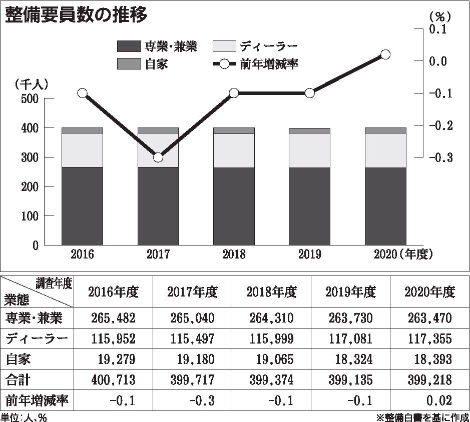 2011年度をピークに減少傾向にある整備要員数が、20年度は前年比0・02%増の39万9218人と下げ止まった。業態別では専・兼業が同0・1%減の26万3470人と9年連続で減少する一方、ディーラーは同0・2%増の11万7355人と3年連...