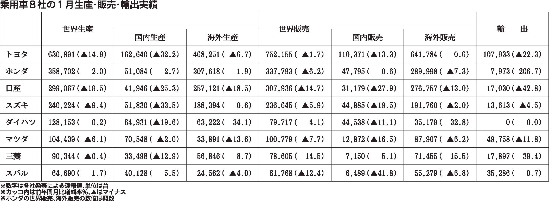 自動車メーカー8社が25日に発表した1月の世界生産の合計台数は、前年同月比9・8%減の191万6510台となった。8社中3社は前年実績を上回り、局所的に回復の兆しもみられたが、長引く半導体不足やコロナ禍の影響で減少幅は昨年12月の5・5%...