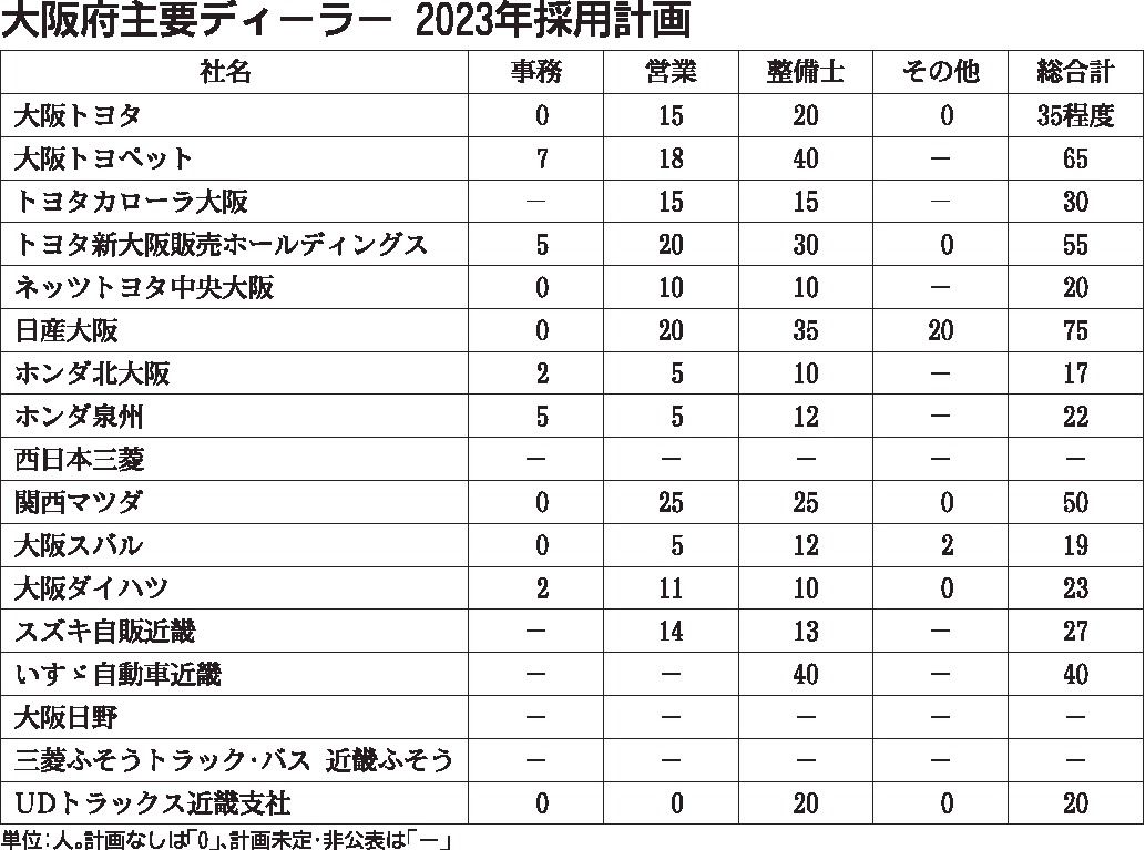 3月1日の広報解禁日を過ぎ、23年3月大学卒業予定者へのアプローチが本格的に始まった。すでに選考の進む整備専門学校生が中心の整備職採用とともに、その動向が注目される。人材獲得競争の激しさが増す中、大阪府内の新車ディーラー各社はどう動くのか...