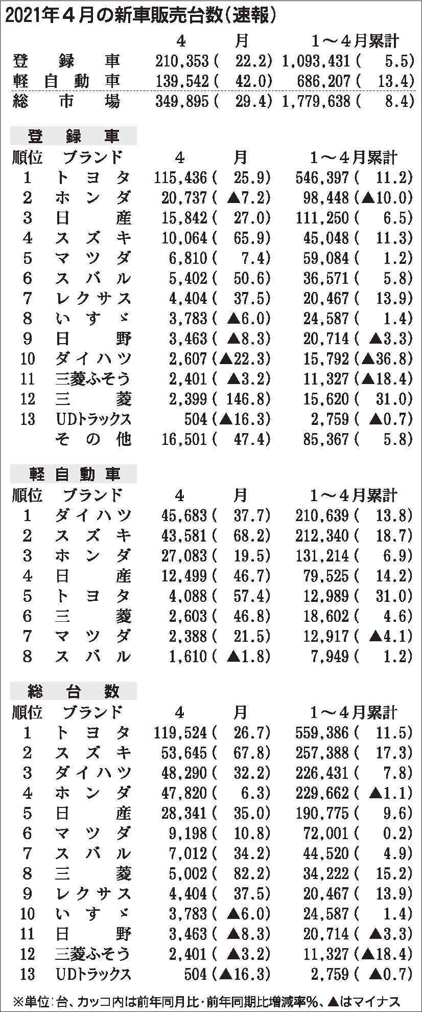 2021年4月の国内新車販売台数、コロナ反動で29%増 登録・軽ともに7ブランドがプラス