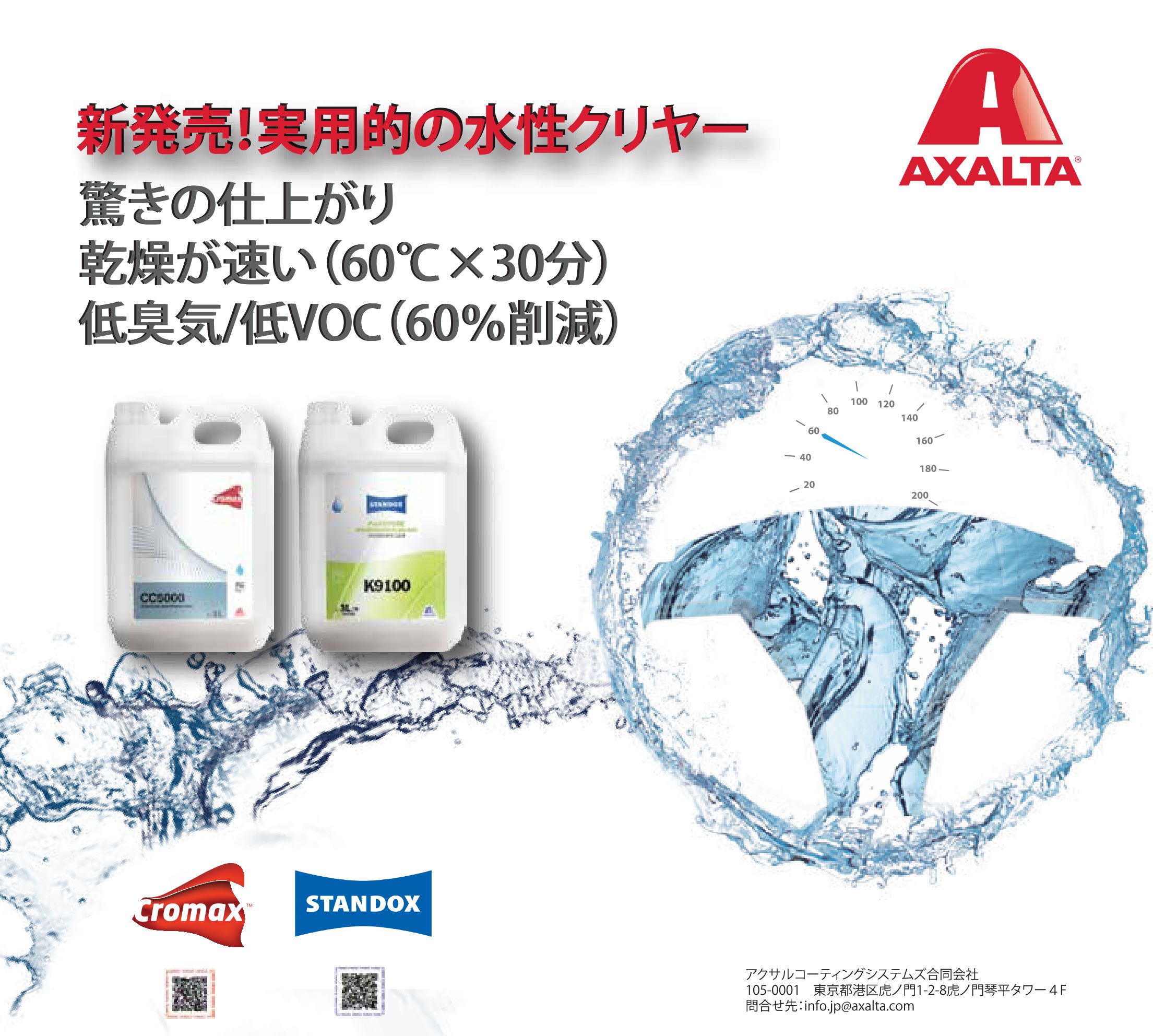 水性クリヤーコートのクロマックス「CC5000 WB パフォーマンスクリヤー」とスタンドックス「プロフューチャー WB クリヤーK9100」は有機則、特化則フリーの環境対応製品。溶剤系クリヤーコートと比べて、揮発性有機化合物(VOC)排出量を約60%低減、低溶剤臭も実現し、環境への配慮と塗装作業者の負担軽減に貢献する。60度で30分の硬化を可能とするなど高い作業性と、仕上がり品質の高さも特徴とする。