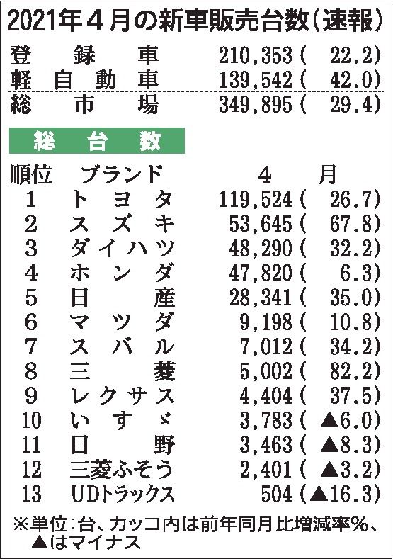 登録車と軽自動車を合わせた4月の新車販売台数は前年同月比29・4%増の34万9895台だった。前年が新型コロナウイルス感染拡大の影響で大きく低迷していたため、大幅増となった。こうした中、ホンダが1桁増にとどまり、登録車販売は4カ月連続のマ...