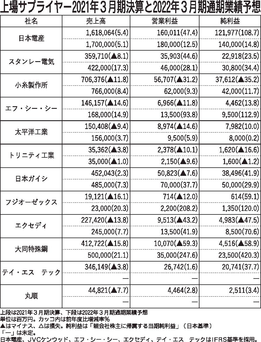 〈上場サプライヤー2021年3月期決算と2022年3月期通期業績予想〉