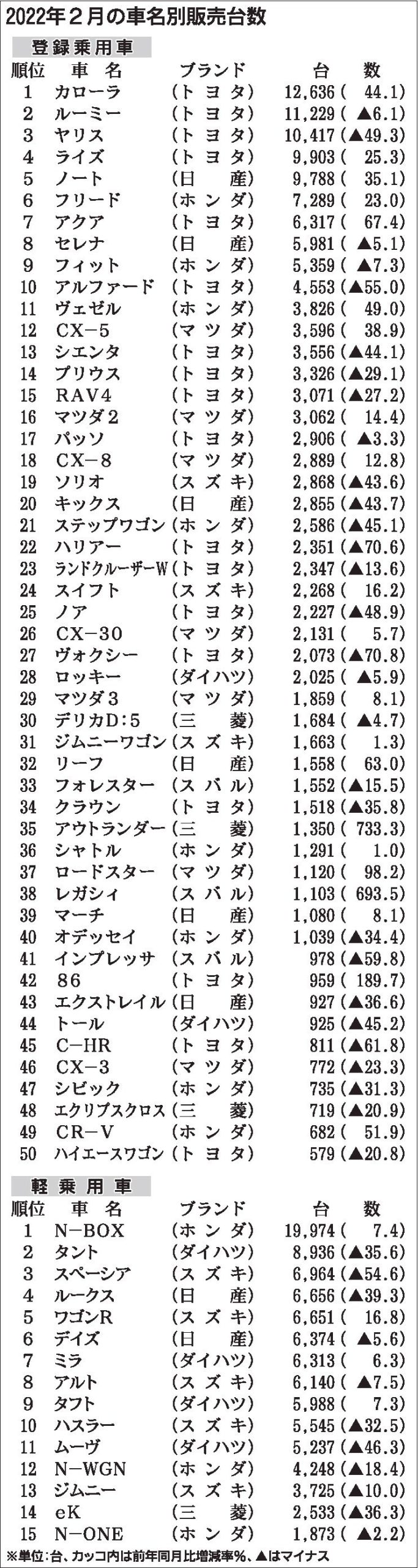 2022年2月の新車販売ランキング、「N-BOX」2ヵ月連続首位 ヤリスは急減速で4位