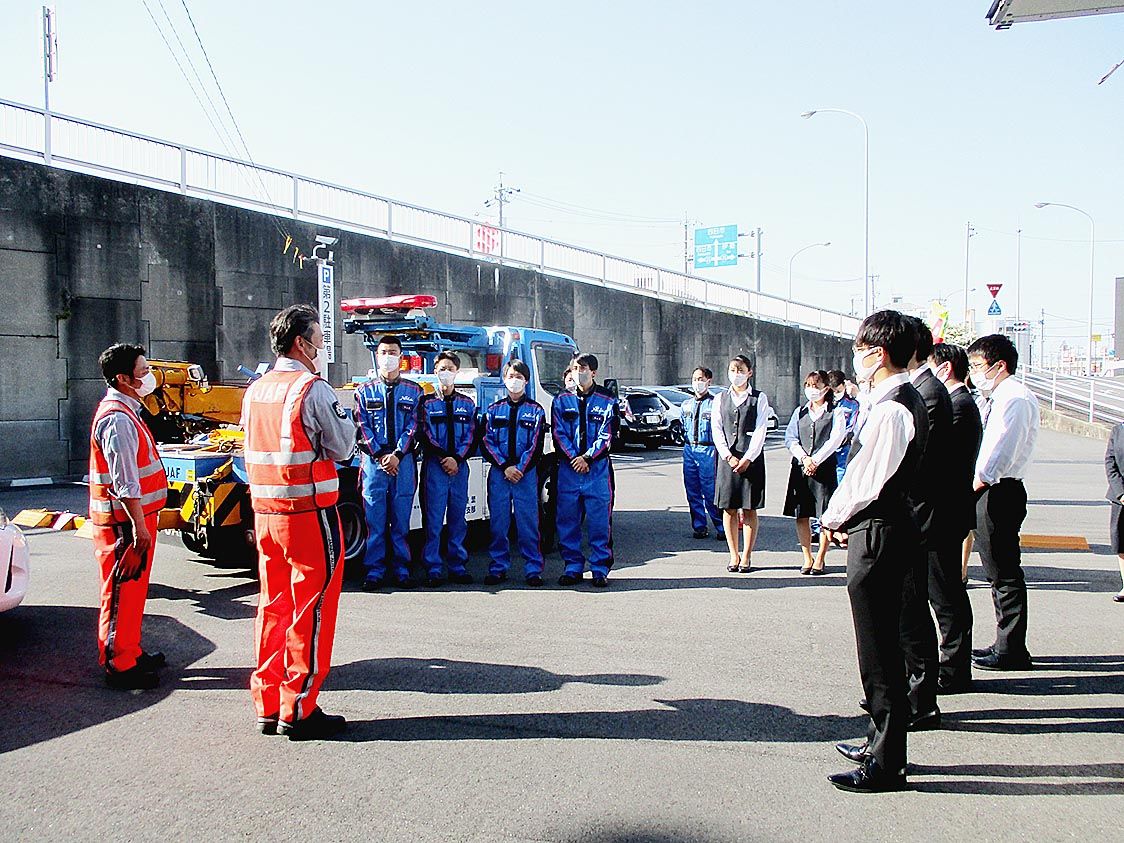 【津】日本自動車連盟(JAF)三重支部(川喜田久支部長)は、ネッツトヨタ三重(平野真也社長)の新入社員を対象に救援作業の実演をはじめとする研修を実施した=写真。 ディーラーの新入社員にJAFの活動を理解してもらうために実施したもの。津市の...