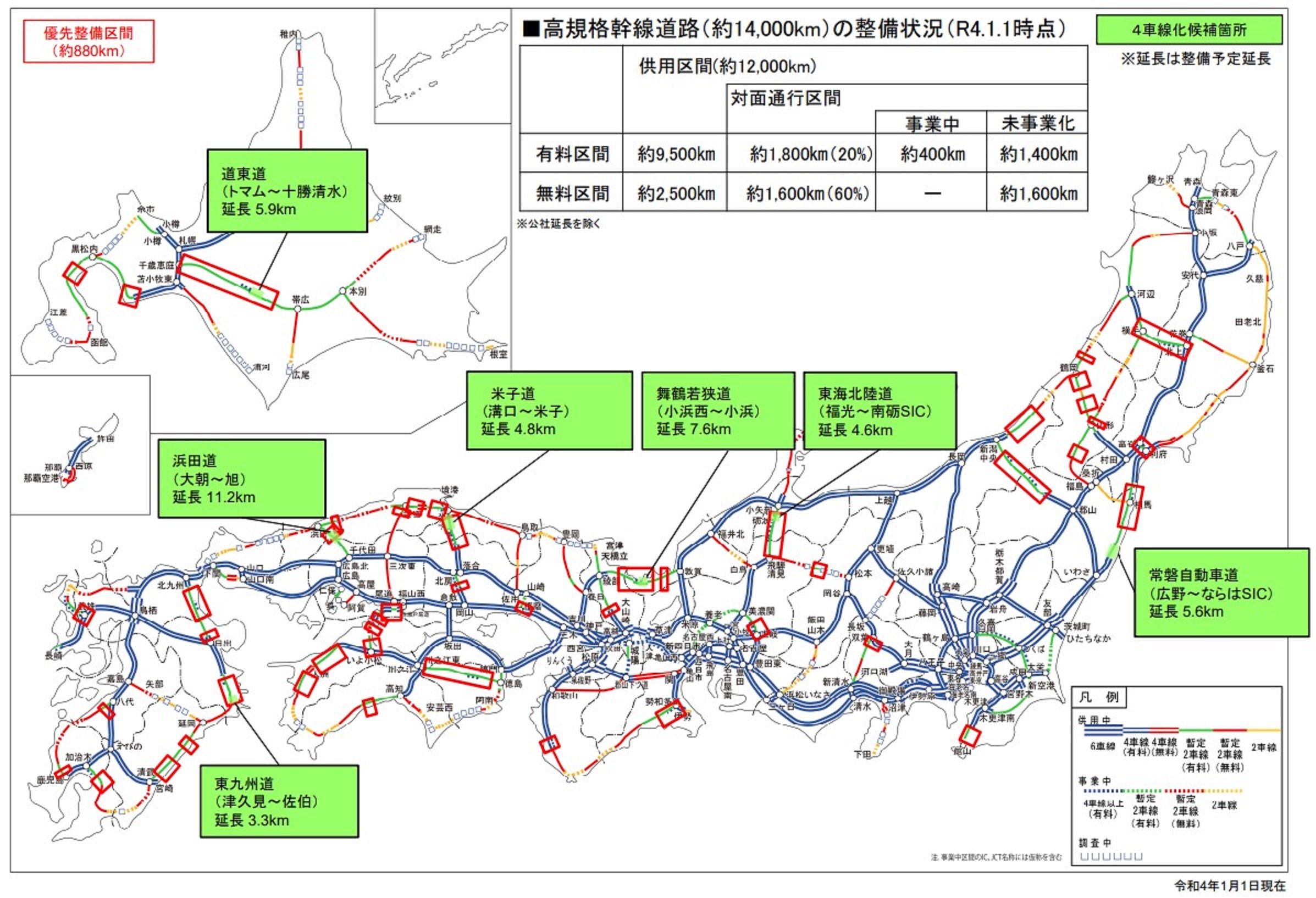 高速道路の暫定2車線区間は、4車線と比べて渋滞や事故防止、災害時の対応などに課題がある。そのため、国交省では19年9月に課題の大きい区間を優先整備区間(約880キロメートル)として選定し、4車線化を順次事業化している。