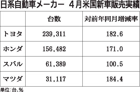 日本の自動車メーカーの4月の米国新車販売台数が出そろった。単月実績を公表している4社全てが前年同月よりも2倍以上多い台数だった。 コロナ禍による落ち込みからの反動で前年同月比が大幅に上振れしたが、4社とも4月単月の過去最高を記録しており、...