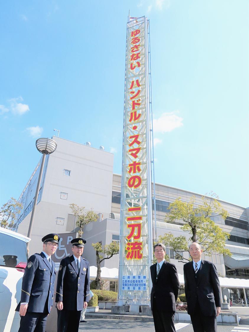 【広島】広島県自動車販売・整備団体交通安全対策推進協議会は、令和4年度の広島県交通安全年間スローガンを印刷した懸垂幕を、広島市佐伯区の広島県運転免許センターに掲出した=写真。 今回のスローガンは「ゆるさない ハンドル・スマホの 二刀流」。...