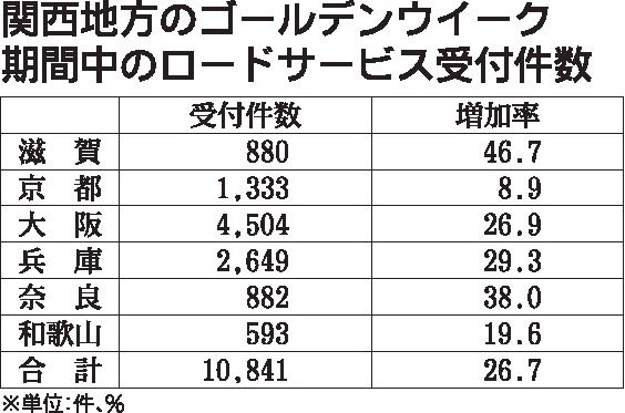 関西地方におけるゴールデンウィーク期間(4月29日~5月6日)中の日本自動車連盟(JAF)のロードサービス受付件数(速報値)は、前年同期比26・7%増の1万841件だった。件数ベースでは2286件の増加。一般道路、高速道路ともに前の年を上...