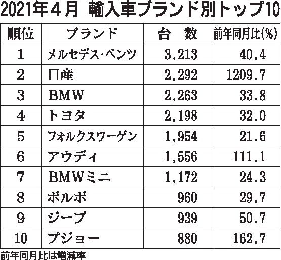 外国メーカー車では、主力の「Aクラス」や今年1月に全面改良した「Sクラス」がけん引したメルセデス・ベンツ(MB)が同40.4%増の3213台で首位となり、BMWが2263台(同33.8増)、フォルクスワーゲン(VW)が1954台(同21.6%増)で続いた。ジープ、ルノー、ポルシェ、フィアット、ランドローバー、アストンマーティンの6ブランドは4月単月として最多台数を記録した。100台以上の新規登録があった全ブランドで前年を上回り、MBとVW以外は1月からの累計台数でも前年比プラスとなった。