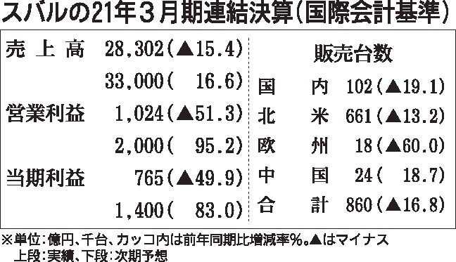 スバルが11日に発表した2021年3月期通期連結業績は、2期ぶりの減収減益となった。世界販売台数は第2四半期(7~9月期)以降、北米市場を中心に回復基調に入ったが、21年初めからの半導体供給不足の影響を受け、5年ぶりに100万台を割り込んだ。ただ、22年3月期通期の連結販売は北米を中心に回復を見込み、新型コロナウイルス禍前と同水準の100万台を計画する。